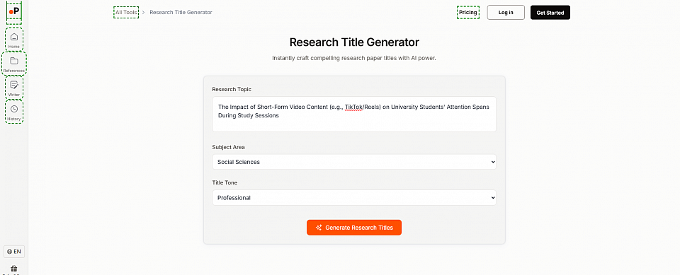 Paperguide.ai is a smart AI-powered platform designed to assist students, researchers, and academicians in streamlining the writing process. One of its most valuable features is the Research Title Generator, which helps users craft precise and impactful research titles. The tool works by asking users to provide a brief description of their research topic, select the subject area such as science, technology, humanities, or social studies and pick a tone that suits the paper, whether analytical, formal, or creative. Once these inputs are provided, Paperguide.ai’s algorithms analyze the keywords and context to generate multiple title suggestions that are discipline-appropriate and coherent. This reduces the common frustration of writer’s block and helps researchers quickly produce a professional title that fits the scope of their work. The tool’s interface is simple and intuitive, allowing users to generate titles efficiently without spending too much time navigating complicated settings. Paperguide.ai is especially helpful for those who are just beginning their research journey or want ideas that align with academic standards. It also offers a free trial period, making it accessible for students and educators to explore its capabilities before committing to a subscription.