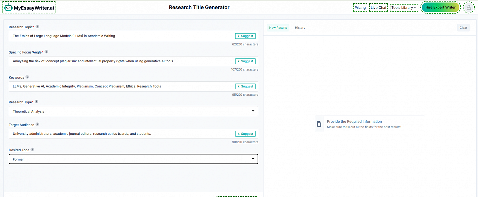MyEssayWriter.ai allows users to input specific keywords or a working thesis. This ensures that the generated titles are highly relevant and closely aligned with the research content.